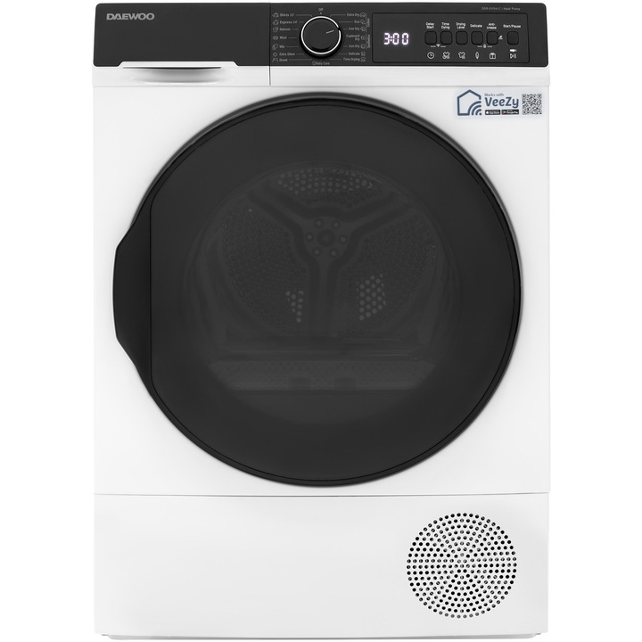 Сушилня Daewoo, Термопомпа, 9 кг, Клас C, Wi-fi функция, Дизайн: Черен панел T2 + Черна XXL врата, Бял
